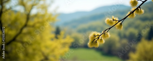 Gentle spring flowers on a branch with a refreshing vibe representing nature's awakening against a blurred mountainous background with copy space