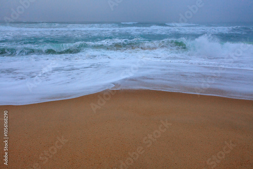Gentle waves roll towards the sandy shore under a misty, overcas