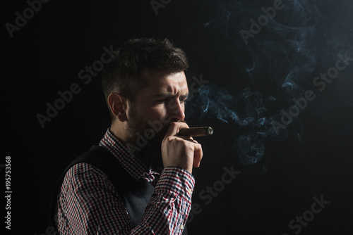Gentleman in checkered shirt and waistcoat smoke cigar. Classical vintage male portrait. Bearded macho with cigar. Elegant man with beard smoking cigar. Copy space for advertise.
