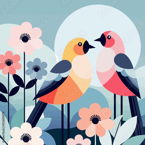 Geometric Bird Art-Colorful Bird Illustration with Flowers-Modern Bird Design-Stylish Bird Artwork-Vibrant Bird Scene-Nature Inspired Bird Art-Cute Bird Illustration