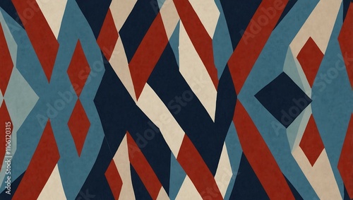 Geometric design with blue, red, and white shapes.