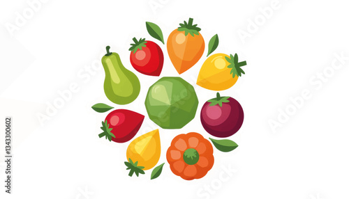 Geometric fruits and vegetables arranged in vibrant circular pattern, healthy eating