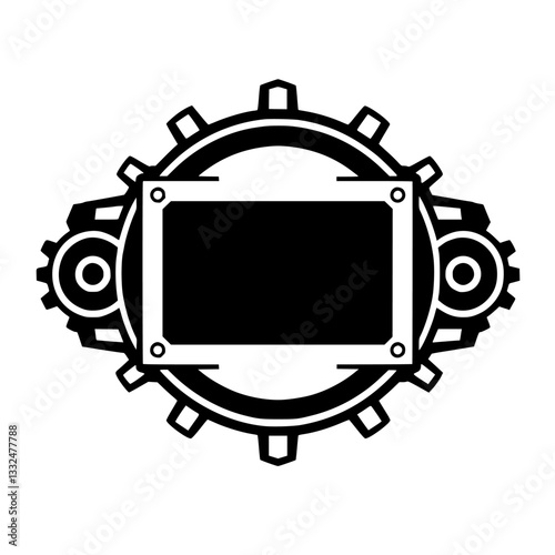 Geometric Steampunk Logo: A stylized black rectangle within a gear-shaped emblem with a white outline, perfect for industrial brands.
