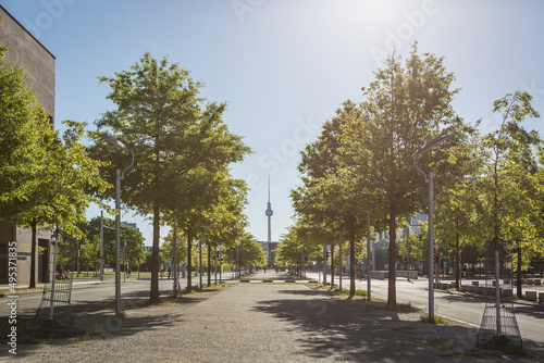 Germany, Berlin, Treelined street in Government District with Berlin Television Tower in background