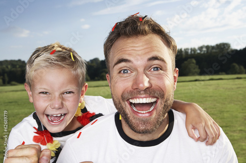 Germany, Cologne, Father and son supporting their soccer team