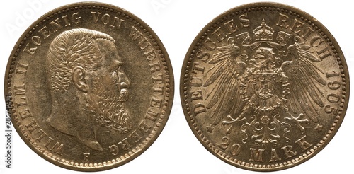 Germany German Wuerttemberg golden coin 20 twenty mark 1905, head of King Wilhelm II right, imperial eagle with shield on chest surrounded by order chain, crown with ribbon above,