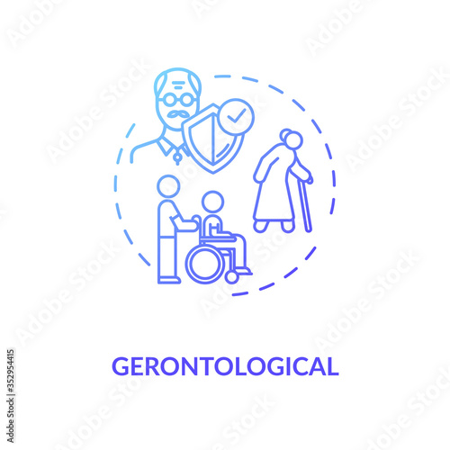 Gerontology concept icon. Community service idea thin line illustration. Aged people care and security. Pensioners caregiving program. Vector isolated outline RGB color drawing
