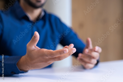 Gesturing with hands, man in blue shirt discussing business at office table, copy space
