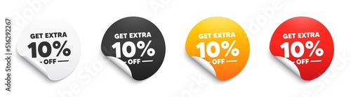 Get Extra 10 percent off Sale. Round sticker badge with offer. Discount offer price sign. Special offer symbol. Save 10 percentages. Paper label banner. Extra discount adhesive tag. Vector