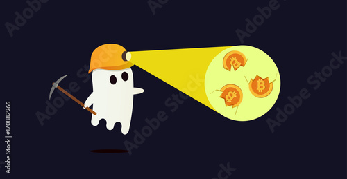 Ghost mining for cryptocurrency found Bitcoins with his flashlight and is ready to mine it with a pickaxe. Vector concept for mining bitcoin cryptocurrency
