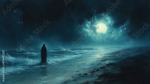 Ghostly Figure on Desolate Beach at Night, Moonlit Waves and Haunting Presence on Seashore
