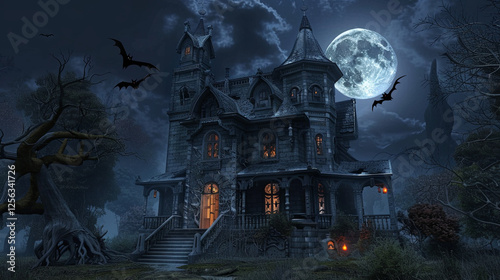Ghostly Haunted House with Floating Spirits and Glowing Lights