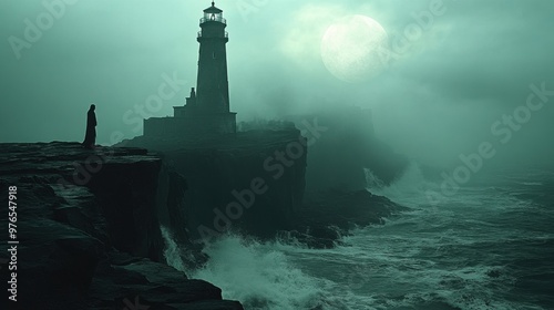 Ghostly Haunted Lighthouse: Eerie Cliffside Scene with Moonlit Ghost Figure and Crashing Waves