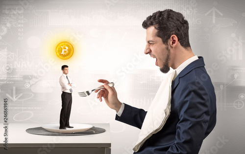 Giant businessman eating small man with financial background