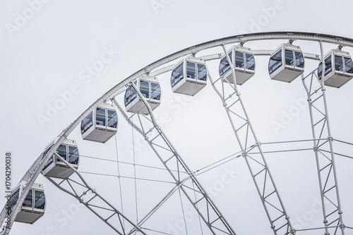 Giant ferris wheel with clear cabins against an overcast sky at an amusement park