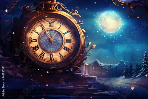 giant ornate clock in snowy night landscape with full moon and distant building