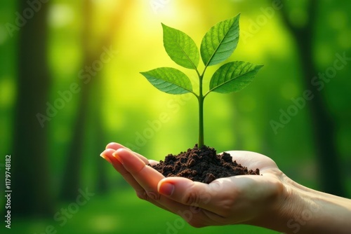 Giant tree sprout held gently in hand, sunlit green background, future, hope