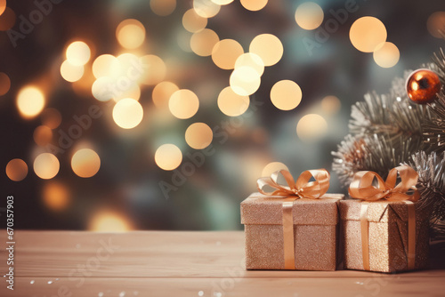 Gift box on table with blur light background.