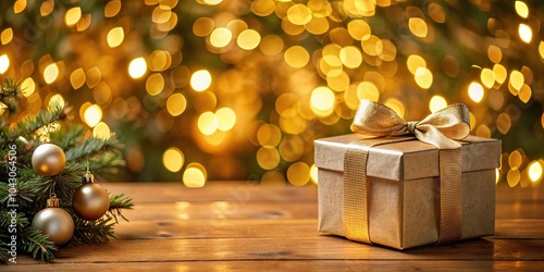 Gift box on table with blurred Christmas tree and golden festive bokeh light background for special holiday