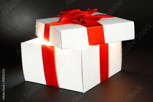 Gift box with bright light on it on dark grey background