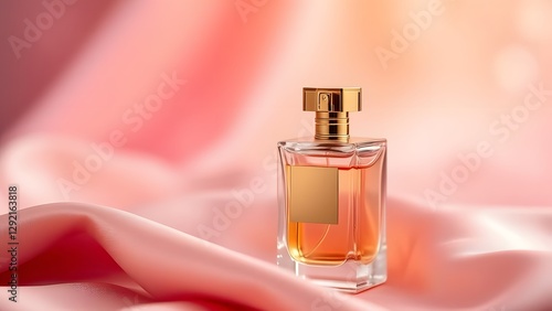 Gilded Elegance Perfume Bottle on Silk with Dreamy Bokeh and Fresh Water Droplets