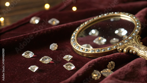 Gilded mirror reflecting scattered diamonds on velvet surface, symbolizing luxury, wealth and extravagant lifestyle, opulence and lavish self-indulgence concept.