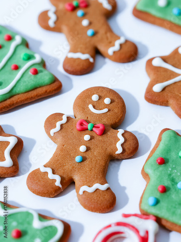 Gingerbread cookies decorated with icing, including gingerbread men and Christmas trees on a white surface