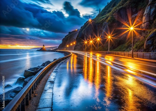Gipuzkoa Coastal Night Drive: Car Lights Reflecting on Wet Asphalt