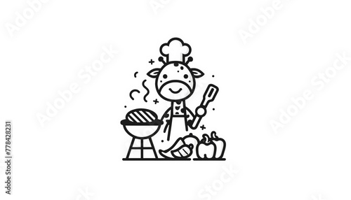 Giraffe cooking with a grill, wearing a chef's hat and apron.