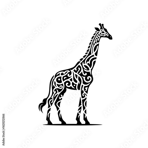 Giraffe illustration isolated on white background with tribal pattern in black color