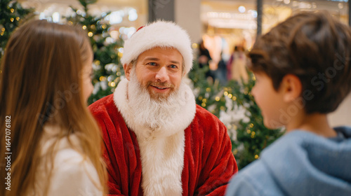Girl and Santa Claus reading Christmas book sitting near Christmas tree at home. Happy New Year