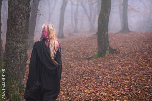 Girl in black hood standing on a stump deep in a dark forest. Waiting for magic to happen. Thick fog all around. Scary autumn scene