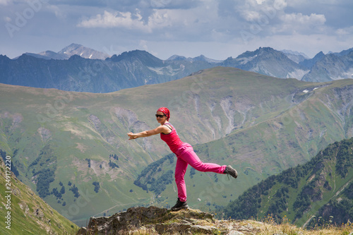 girl in pink pants standing on a rock on a cliff on one leg against the mountains