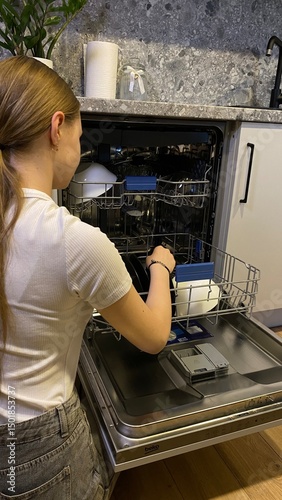 Girl loading dishwasher in modern kitchen interior with clean tableware and organized space