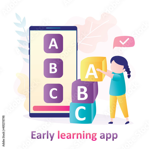 Girl playing educational game with cubes. Early learning application on mobile phone screen. Child learns the alphabet using app