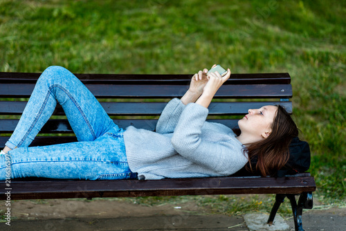 Girl schoolgirl. In summer, he lies on a bench in city. In the hands of holding a smartphone, watching a video. Concept of rest after school. Emotion is a pleasure pleasure.