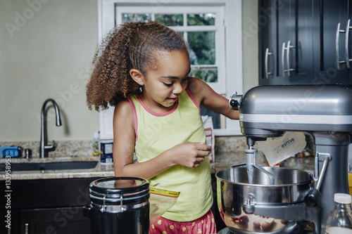 Girl using whisking machine in the kitchen