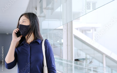 girl wear mask using a smartphone,on footbridge