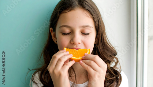 Girl with brown hair enjoying a juicy orange slice, healthy eating concept, bright and cheerful mood, natural light, close-up portrait.