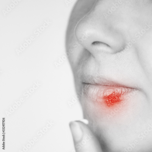 Girl with herpes. Sick mouth symptom. Lips cold. Red round concept. Finger near head. Woman face. Healthcare infection. Close view