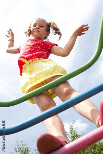 Girl with pigtails plays on the playground