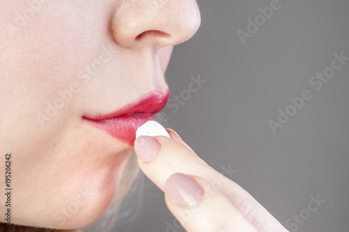 girl with red lips takes a pill