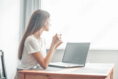 Girl working on computer laptop in light room