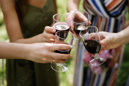 Girls Drink red wine enjoy to party outdoor on green background, Business People Party Celebration Success Concept