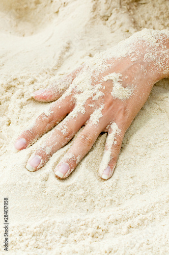 Girl's hand on the sand, top view