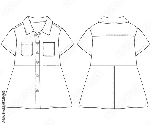 Girls Short Sleeve Denim Shirt Dress Technical Flat Vector