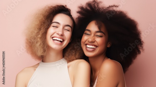 Girls women multiracial multinational happy laughing on one color monochrome background pastel color
