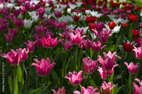 glade covered with many violet pink tulips