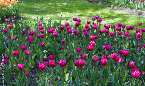 glade with large bright multicolored tulips lit by the sun.