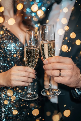 Glamorous couple celebrating with champagne festive event blue and gold bokeh background elegant atmosphere